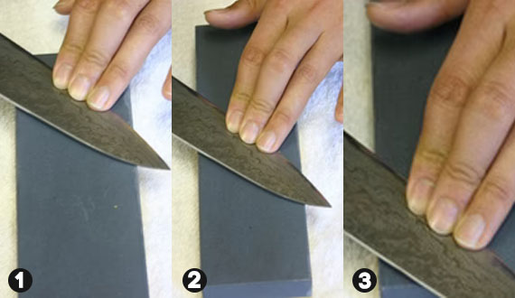 Just as you did before, sharpen the knife keeping an angle of 10-15mm. Push the point you want to sharpen with your first, second and third fingers. While keeping the angle and pushing the point with your fingers, stroke the blade until it reaches the other edge of the Wet Stone and then pull the blade back until it reaches the edge of the Wet Stone (this back and forth is counted as one stroke). Repeat it for about five strokes until you can see or feel some small burrs (edge curvatures). Move the position of your fingers to where you have not sharpened yet, and repeat this from the tip to the base of the blade. If your Wet Stone starts to dry up just water it and keep sharpening your knife.
